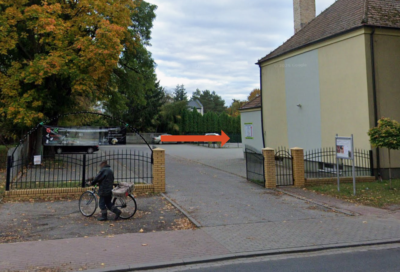 Wejście przez bramę główną od ulicy Konsytucji 3 Maja.